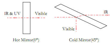 Cold Mirror: AOI 45°,Ravg>90%@420-630nm; Hot Mirror:AOI 0°, Tavg>90%@750-1200nm