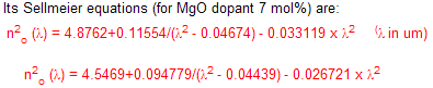 The typical size of MgO:LiNbO3 crystals is (3 - 10) x (3 - 10) x (10 - 30) mm3 for OPOs & OPAs and frequency doubling & mixing, and 20x20x1 mm3 for waveguide substrates. Other specs. and AR-coatings for MgO:LiNbO3 are available upon request.