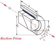 Rochon prisms are beam splitting polarizers. The optic axis is parallel to the input beam for the first prism and perpendicular to the input beam for the second prism. This results in two orthogonal-polarized output beams. The ordinary ray is undeviated, the extraordinary ray deviated by an angle, theta, which is a function of wavelength and the prism angle.