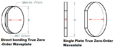 真零级波片 是由 一个零级波片 与一个 BK7(或融熔石英) 窗片 组合而成,将一个零级波片 胶合到 BK7 窗片 上,波片 的 厚度很薄(小 于 0. 1 mm), 而 BK7 窗片厚度可以 根据客